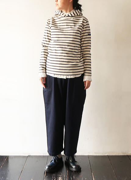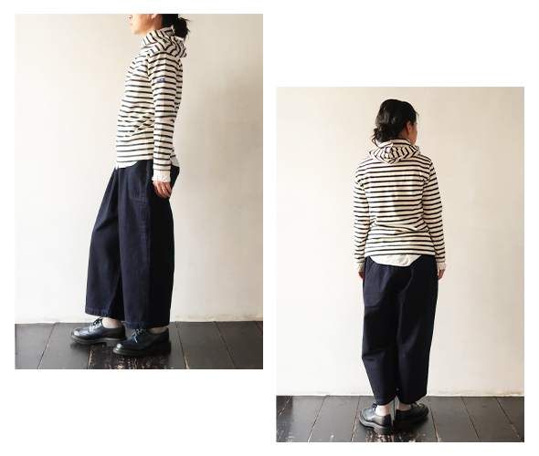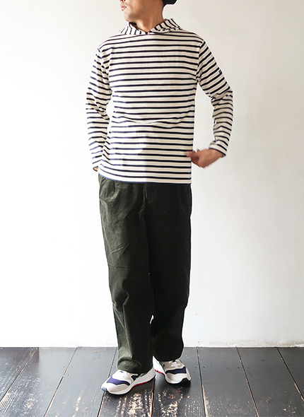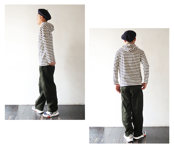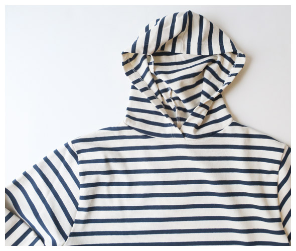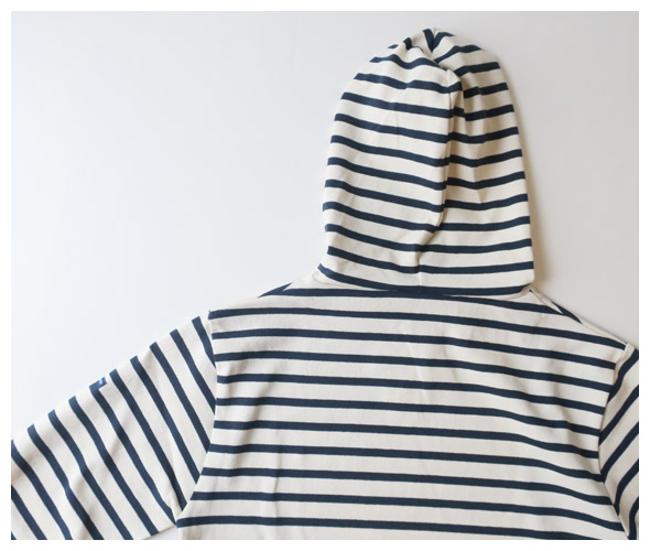 定番バスクシャツにフードがついたパーカータイプのシャツはウエッソン素材の少し薄手コットン100%。フードのバランスなどがウエッソン同様セントジェームスらしい伝統的なマリンスタイルです。重ね着アイテムとしてオールシーズン活躍します。