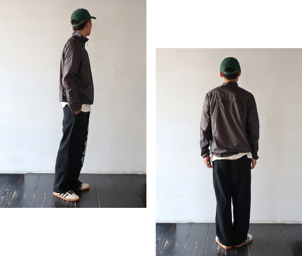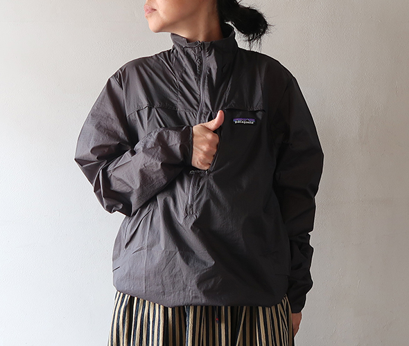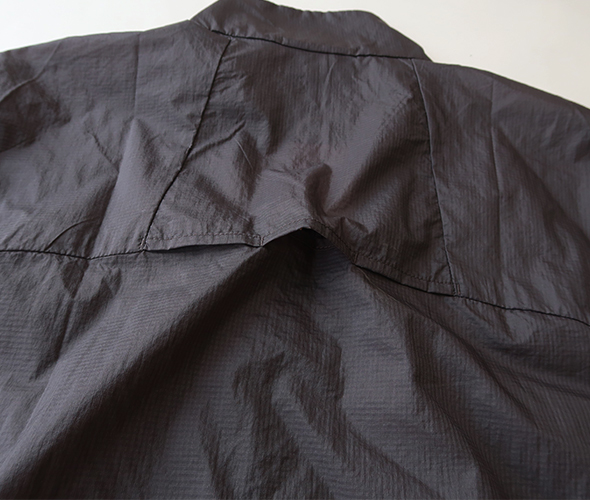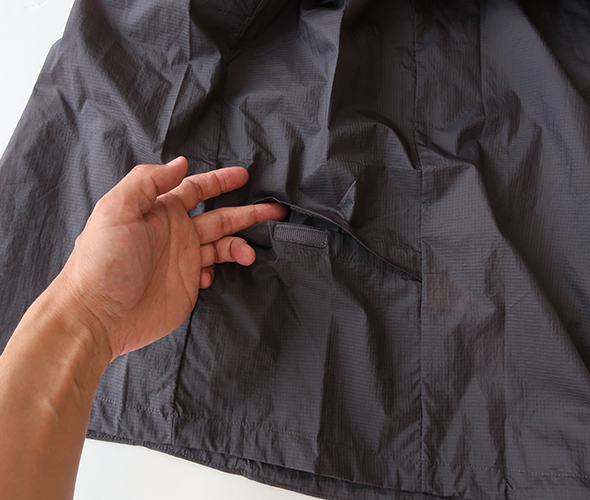超軽量なリサイクル・ナイロン100%のリップストップ素材を使用したプルオーバー。シェルには、軽度の水分を弾く撥水加工が施されています。小物を収納できる大きさの、テープ留め付きサイドポケットが2つ。左胸のジッパー式ポケットは貴重品を収納でき、ジャケット本体を収納可能です。左胸と右胸、背中中央にスリットがあるので蒸れにくい仕様。デイリーユースはもちろん、アウトドアシーンでも高い機能性を発揮するアイテムです。