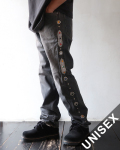 適度にフィットするヒップ周りとテーパードをかけたシルエットの14ozのブラックデニムモンキーCISCOデニムパンツ。両サイドにヴィンテージライクなスタッズを打ち込み、ユーズド加工を施しています。ボタンフライ仕様。