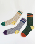 かかとのスマイルがほっこりかわいいソックス。甲まわりがリブ仕様になっているので、しっかりホールド感があります。はき口のカラフルな2ラインとつま先がアクセントの、温かみのある優しい色合いの杢ソックスに仕上がっています。