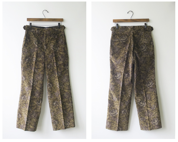 ブランドの定番アイテムとして展開されているサイドタブトラウザーパンツ。ドビーコーデュロイボタニカルプリントを使用しており、穿き心地を重視したやや太めのストレートシルエットがポイント。過度な装飾を削ぎ落とし、シルエットを強調したデザインが魅力的なアイテムです。