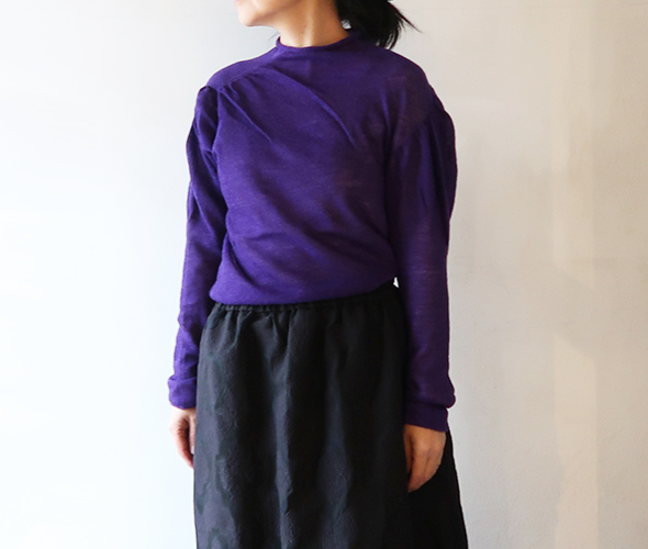 細身のシルエットに少しボリュームが出る、ギャザーのはいったパフスリーブがワンポイントの薄手ニット。