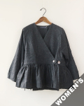 カシュクールタイプのベルトギャザーチュニック。素材には、CORDURAナイロン+ウールの混紡糸を使用し、ウールの風合いは最大限に残しながら、耐久性を兼ね備えています。切り替えからのふわりとしたギャザーに、上品な印象のピンストライプ、サイドの貝ボタンがアクセント。中には紐が付いており、シルエットもボタンの位置を変え、お好みで楽しめます。