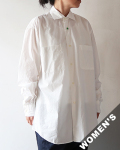 さらっとしていて軽やかで、薄手ながらもハリのある、上質なコットンタイプライター生地を使ったロングシャツ。すっきりとしたシルエットに少し長めの袖丈、ボタンは貝ボタンを使用し、2つ目のボタンはインドのガラスビーズでアクセントに。シャツ専門の縫製工場、唐津シャツ工房で縫製された上質な仕立て。今の時季は羽織りに、秋から冬は重ね着に、色んな着こなしが出来る一枚です。