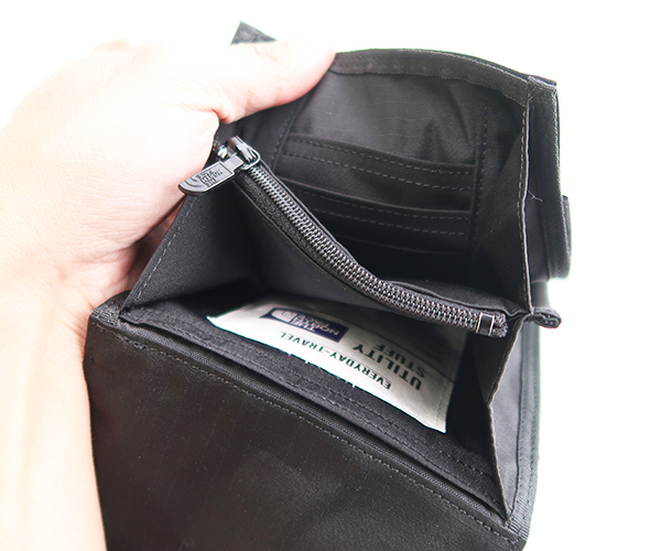 中身の出し入れがしやすいマチ付きのメインコンパートメントに、内側に4つのポケットとカードスリットを装備。