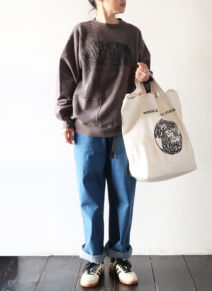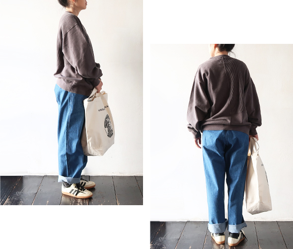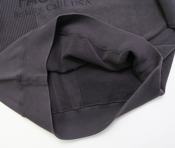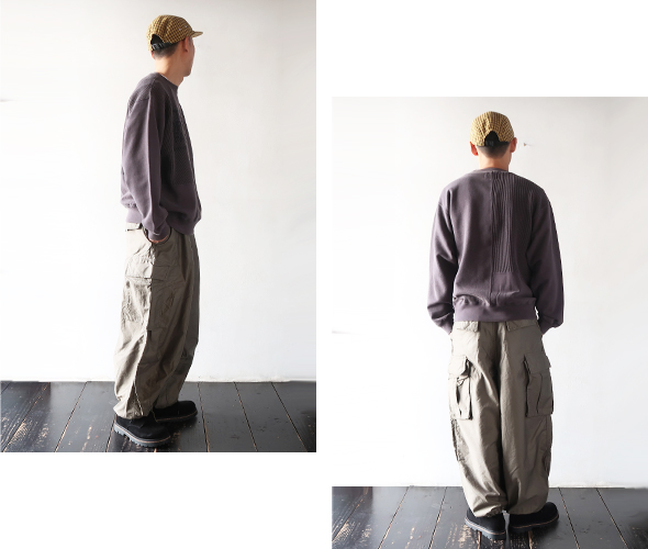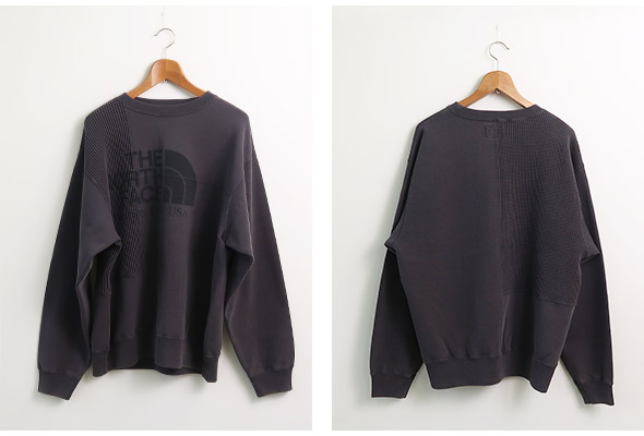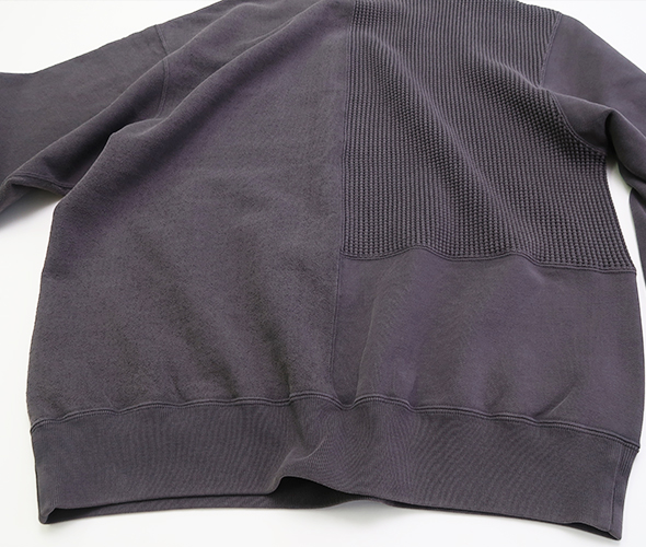 オーガニックコットン裏毛素材を使用したクルーネックスウェットが入荷です。 複数の生地を使用したリメイク感のあるデザインで、肩幅と身幅にゆとりのあるフィット。
