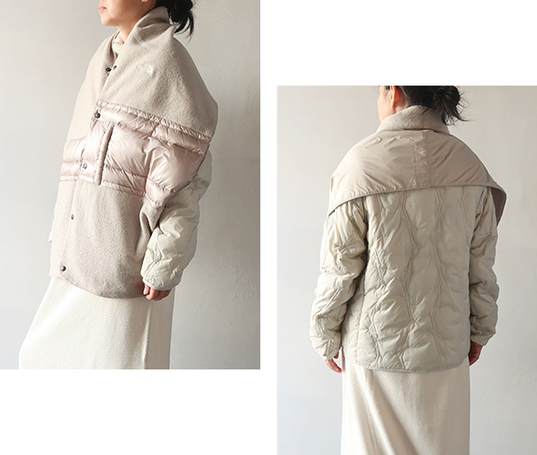 キルト部分に光電子® ダウンを使用したフィールドリバーシブルケープ。独特な膨らみと柔らかい風合いに仕上げた生地が特徴的。両面にTHE NORTH FACEロゴ刺繍、THE NORTH FACEロゴドットボタンを使用。様々なトップス上からラフに羽織れて、使い方を楽しめるアイテムです。
