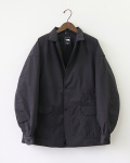 表地はストレッチ性があり、天然素材の風合いを持つナイロン素材。裏地には蒸れづらい仕様のナイロン素材を使用しており快適な着心地。中わたには、通気性とストレッチ性のあるスリット入りの化繊わたを採用しています。左右にフラップ付きポケットと、両脇にファスナーポケットを配置。襟はオケージョンに応じて開衿とコーチジャケット仕様の2WAYでの着用が可能です。デスクワークなどの前傾の動きに特化した、前後差のある特徴的なパターン設計を採用し、フロントのロゴ入りボタンがデザインのアクセントに。旅先での行動や出張時のパフォーマンスを向上する機能を持ちつつ、都市生活に対応するデザイン性を高めたオンオフ問わず活躍するアイテムです。携行に便利なスタッフサック付き。