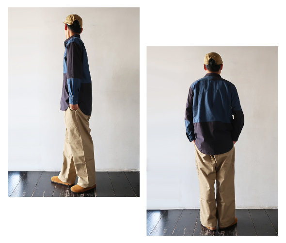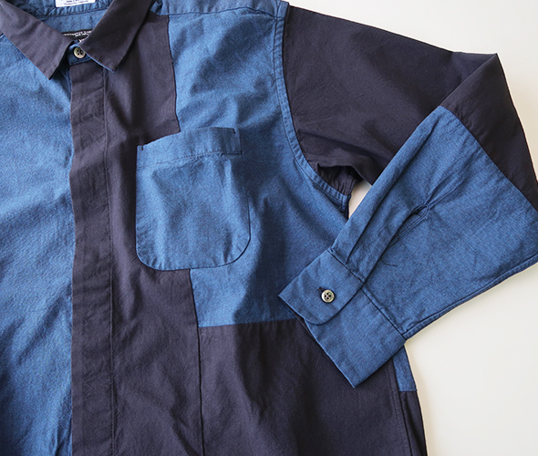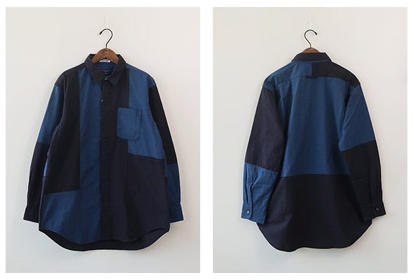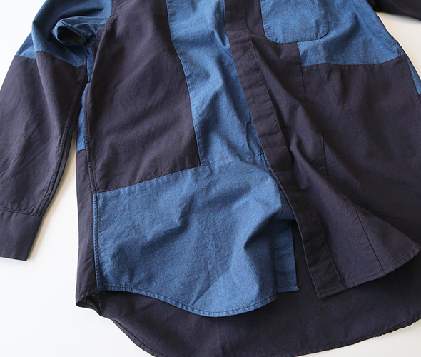 比翼仕立てによるドレッシーなデザインにパッチワークの遊び心をプラスしたショートカラーシャツ。