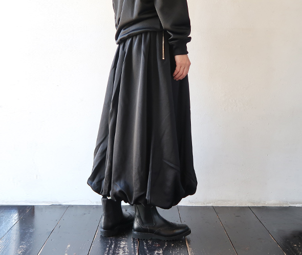 裾にかけて丸みを帯びた、バルーンタイプのデザインが印象的なデザインのスカート。ギャザーがたっぷりと入る事で、動くたびに立体感が生まれます。光沢のあるジャージー素材を使用しており、カジュアルな素材でありながらエレガントな印象です。生地に程良い重量感があるので、ボリュームが出すぎず落ち感のある、綺麗なドレープシルエットをお楽しみいただけます。同素材の Mock Neck Shirt とセットアップもおすすめです。