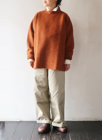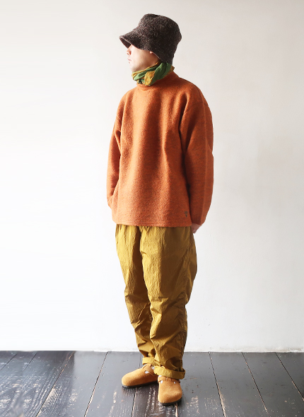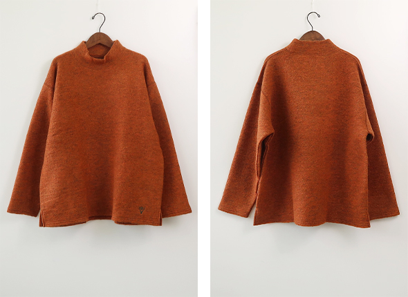 シンプルなボックスシルエットが特徴のモックネックシャツ。裾のサイド部分にはディアスカルの刺繍とスリットが施されています。縮絨のかかったボイルドウールジャージーを採用し、風を通しにくく保温性も高い機能的な一着。全体的にゆとりのあるワイドなサイジングで、リラックス感のある雰囲気が漂います。軽量で柔らかく温かみのある風合いに、上品な印象のモックネックで、一枚着としてはもちろん、レイヤードにも最適なアイテムです。