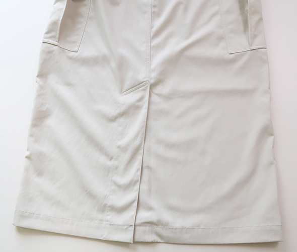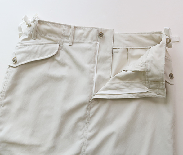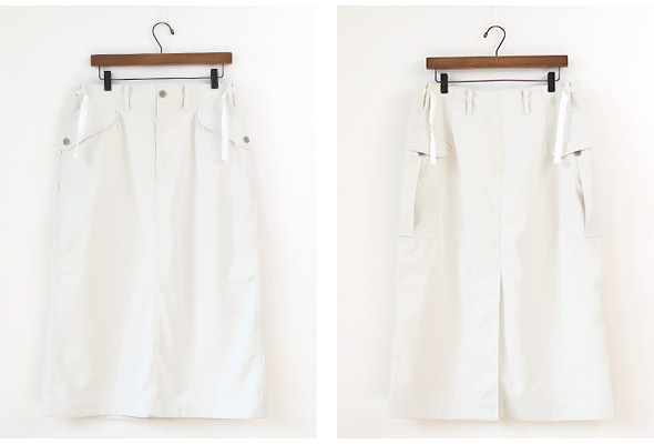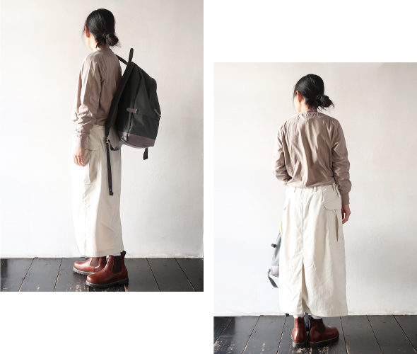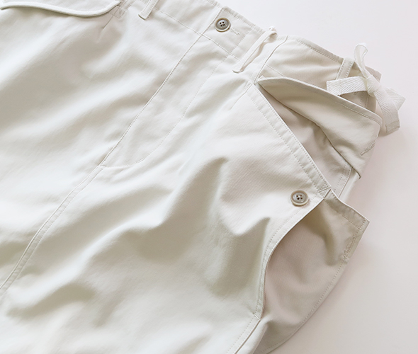 吸汗速乾性が高いリサイクルポリエステルを使用したカーゴスカート。軽やかさがあり、コットンライクでヴィンテージの風合いが特徴です。ウエストはドローコードでサイズ調整が可能で、カーゴポケットのダーツは深くしてあり、ボタンにより容量がアップする仕様です。機能性を取り入れながらも、すっきりとしたデザインで落ち着きがあり、デイリーウェアとして取り入れやすい仕上がりです。