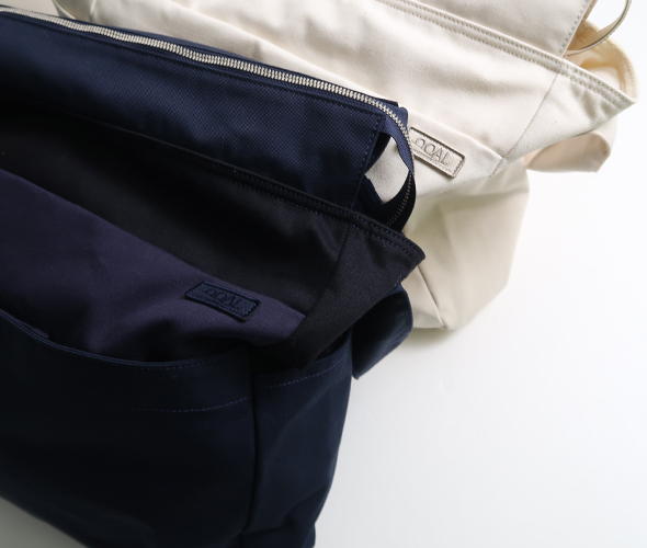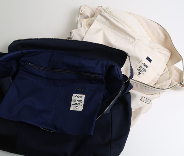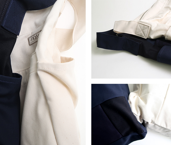 表側には生地切り替えを利用した大小様々なポケット、内側には3つのポケットがあり、荷物の仕分けに便利。