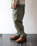 ミリタリーサテン生地を使用したOvergrown Pants。M-51やM-65等のミリタリーパンツをベースにし、お馴染みWHOLE HOLEシリーズの2段のオーバーポケットをプラスしたデザインで、膝にはタックが入り、裾が絞れる作りです。やや太めの存在感のあるパンツ。