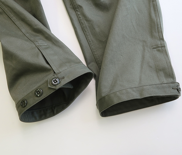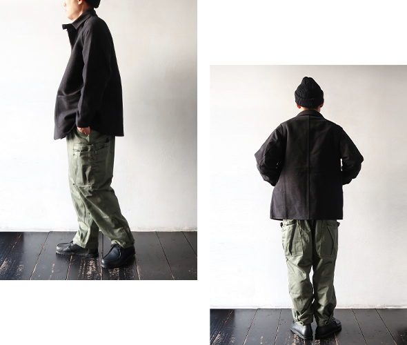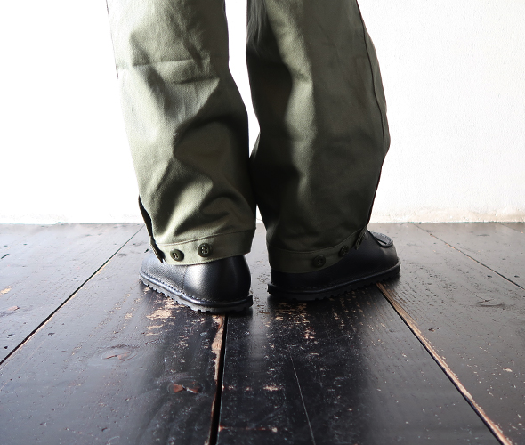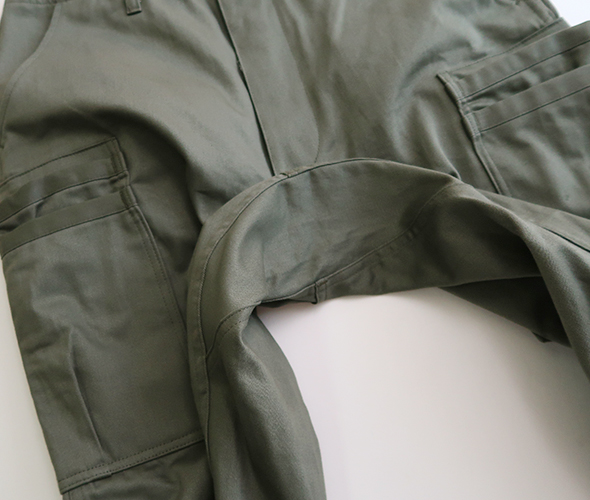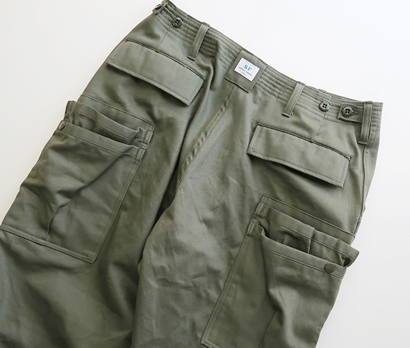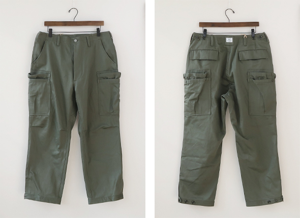 スレン染料が施された、ミリタリーサテン生地を使用したパンツ。M-51やM-65等のミリタリーパンツをベースにし、お馴染みWHOLE HOLEシリーズの2段のオーバーポケットをプラスしたデザインで、膝にはタックが入り、裾がボタンで調節できる仕様です。光沢がありやや上品さも感じる風合いに、9分丈にやや太めのシルエットで軽快な穿き心地です。