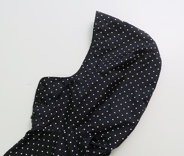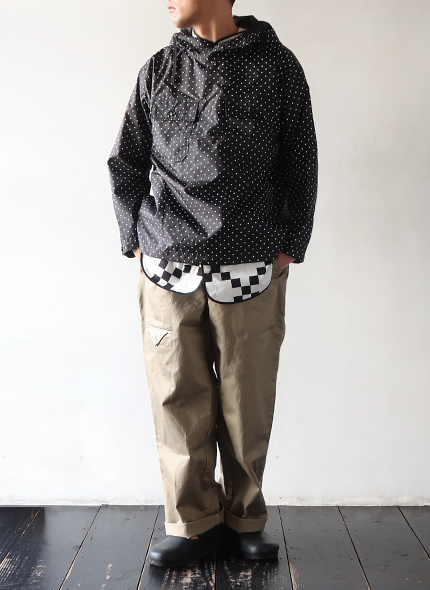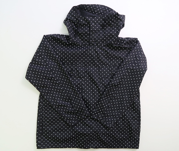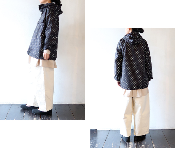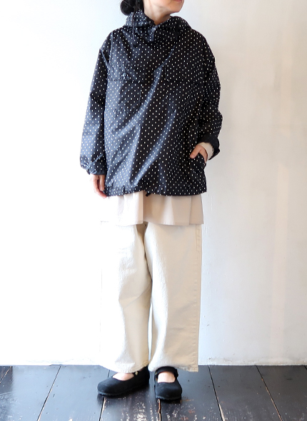 強度があり軽くハリ感のあるナイロン素材のタフタ生地を使用した、プルオーバーのフーディ。首元と裾にはドローコードを備えており、シルエットに変化をつけてお楽しみいただけ、単体ではもちろんレイヤードアイテムとしても活躍する一着です。シックなカラーのポルカドット柄でスタイリングに取り入れやすく、さりげなく個性を加えてくれるアイテムです。