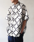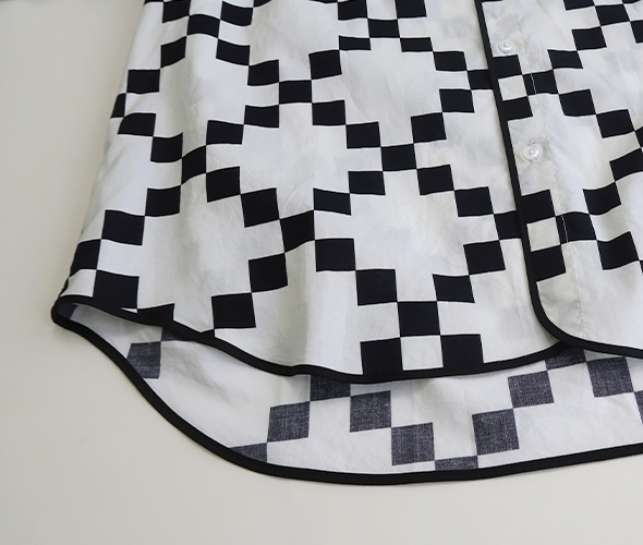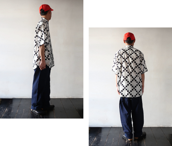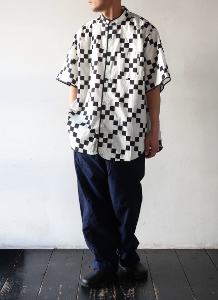 首元がバンドカラーですっきりとした涼しげのある印象の半袖シャツ。生地の端にはパイピングが施され丸みのある仕上がり。軽やかなコットン素材に、ゆったりとしたシルエット、チェッカーパターンがコーディネートに自然なアクセントをプラスしてくれます。