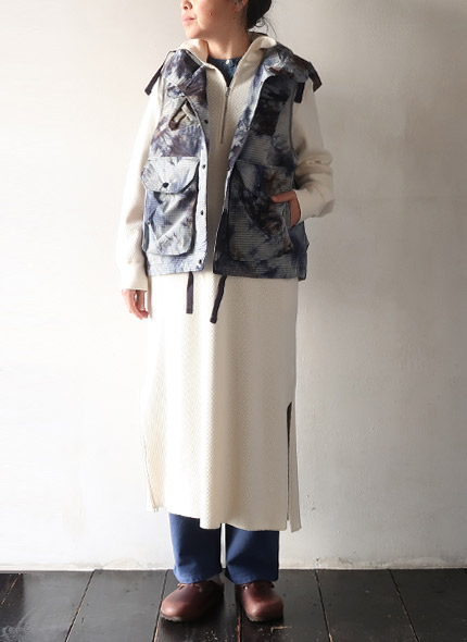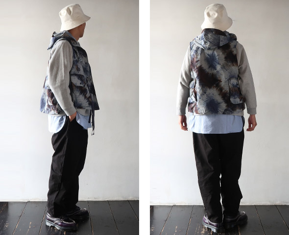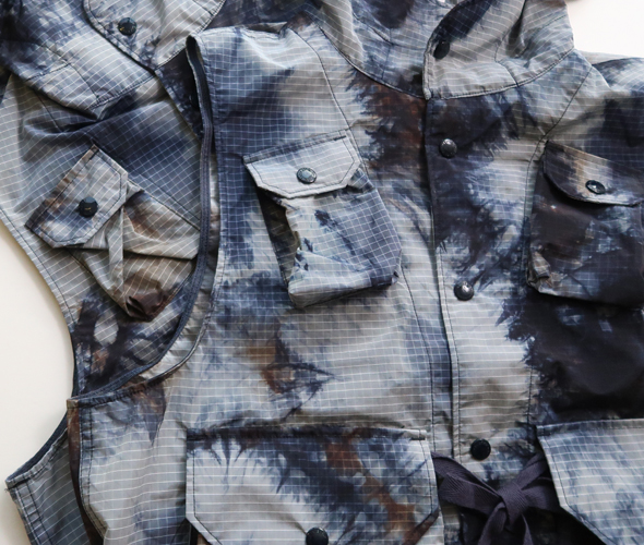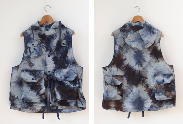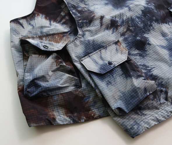 フロントに配されたマチ付きの大容量ポケット、スナップボタンやドローコードなど、アクティブなディテールを多数装備したフィールドベスト。アウターやジャケットの内外どちらでもレイヤードが楽しめるユーティリティ性の高さが魅力です。軽量で耐久性の優れたリップストップ生地に、存在感のあるタイダイプリントを施しており、コーディネートのアクセントとしても活躍します。
