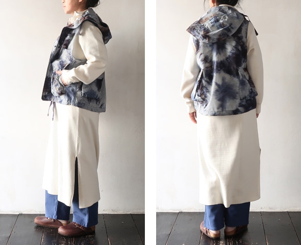アームホールが大きめなので、ゆったりとしたトップスにも合わせられますし、軽やかな素材でインにもアウトにもレイヤードが楽しめます。