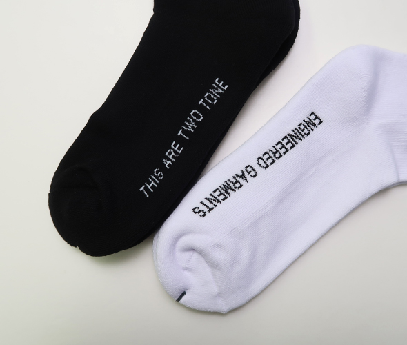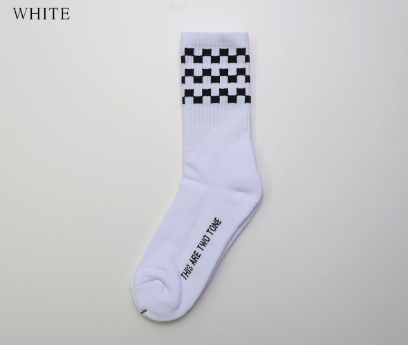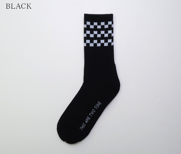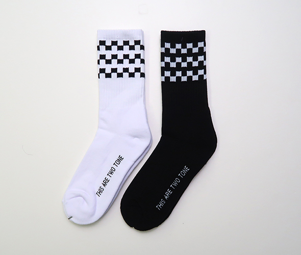 今シーズンを象徴するチェッカーフラッグ柄のクルーソックス。THIS ARE TWO TONE と ENGINEERED GARMENTS の文字がプリントではなく織り仕様と、拘った作りになっています。主張しすぎないデザインで、程よく足元にアクセントを加えてくれます。