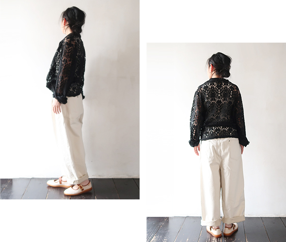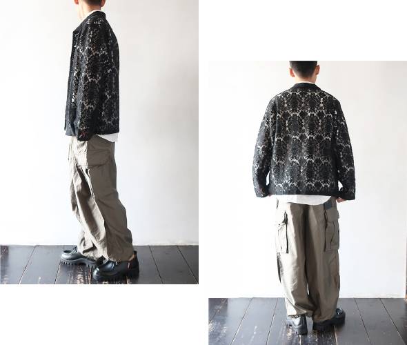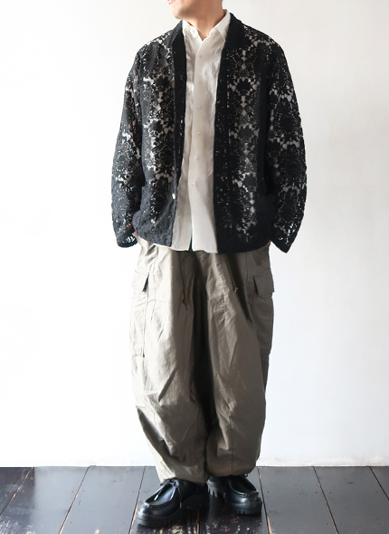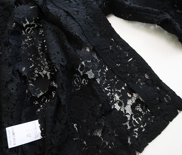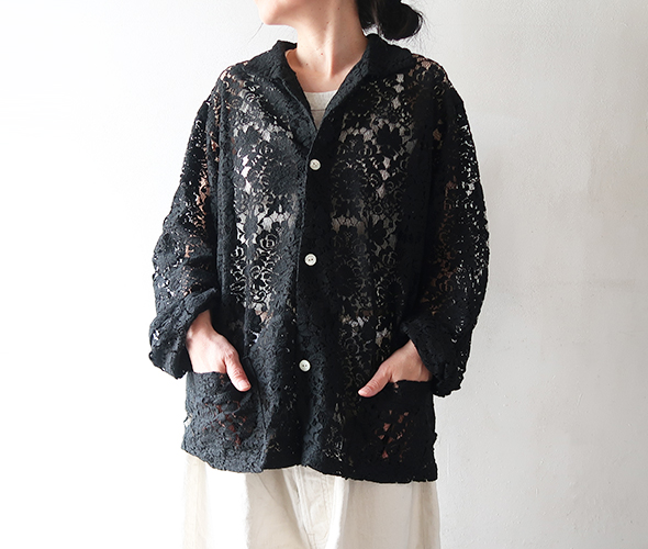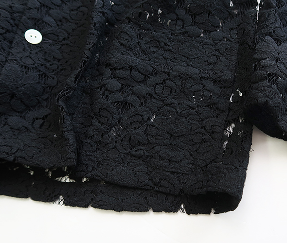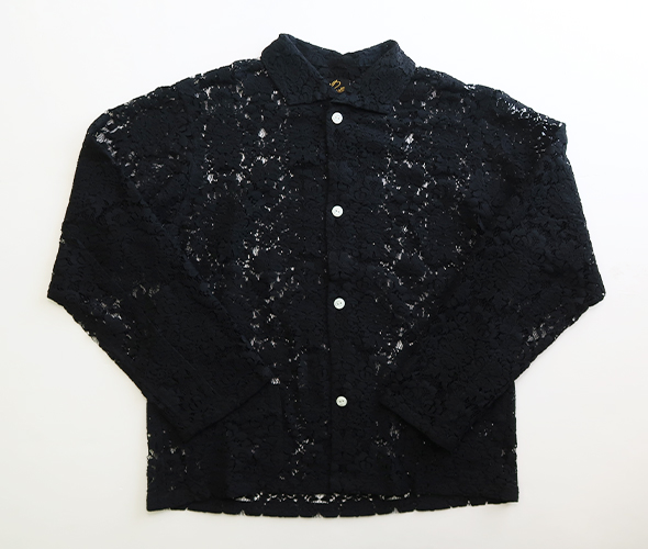 大きく広がったワイドスプレッドカラーが特徴的なシャツ。繊細な透け感をもつラッセルレース素材を用いることで、クラシックなシャツスタイルも涼し気で軽やかな仕上がりです。ボックスシルエットのゆったりとしたサイズ感が、素材の落ち感と相まってリラックスした雰囲気を演出します。シンプルなインナーに羽織るだけで、透け感を活かしたユニークなレイヤードスタイルを楽しめる、ブランドらしい存在感ある一着です。