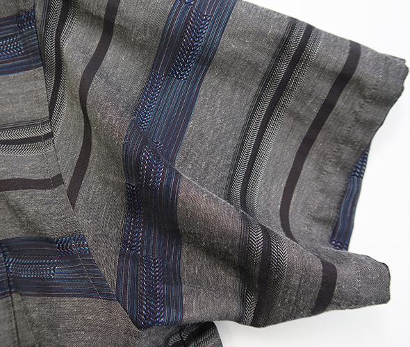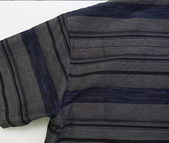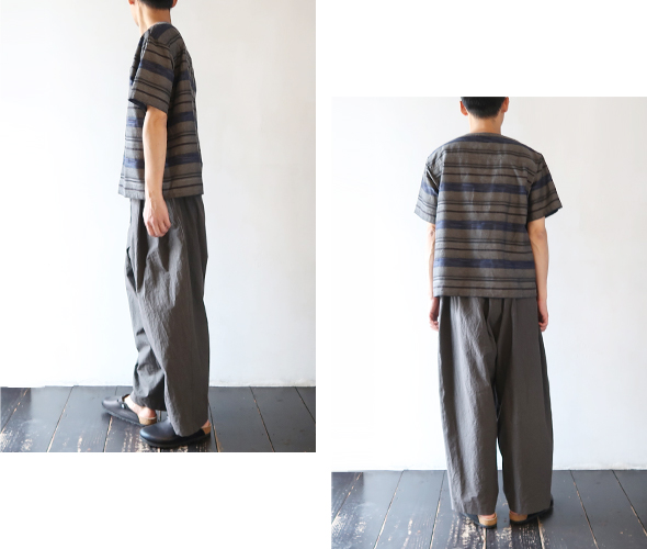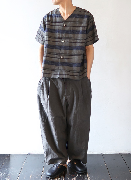 ノーカラーのシンプルなVネックショートスリーブシャツ。軽やかで通気性がありつつ、しっかりとハリ感のある素材です。カスリ特有のほのかなかすれ模様が、ナチュラルで表情豊かな仕上がりです。