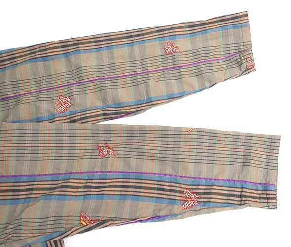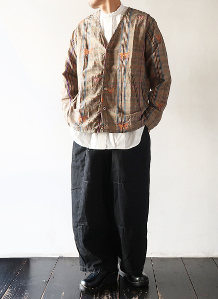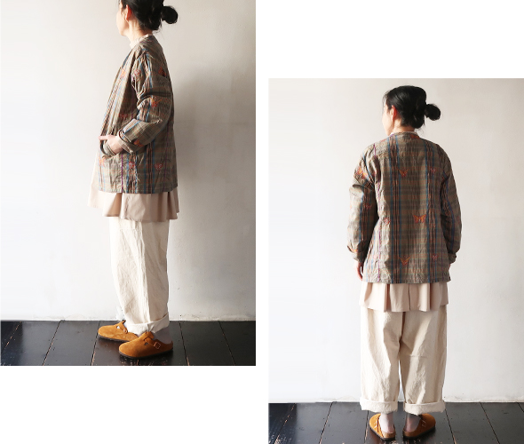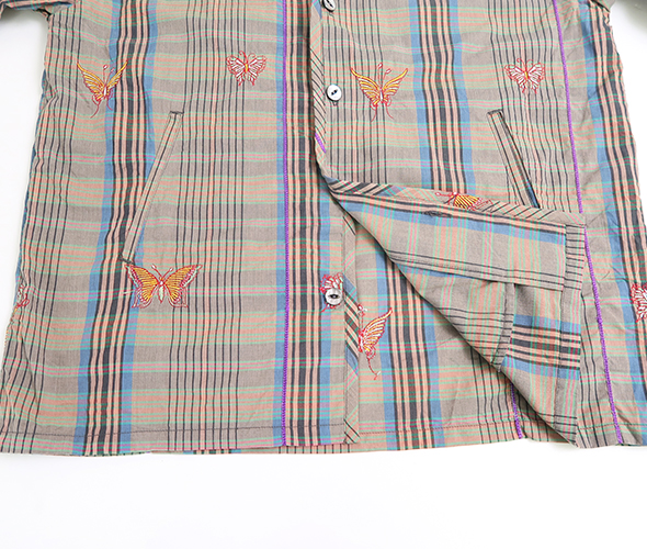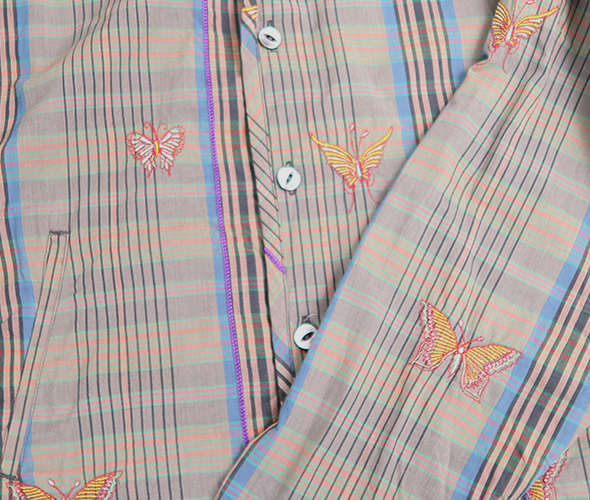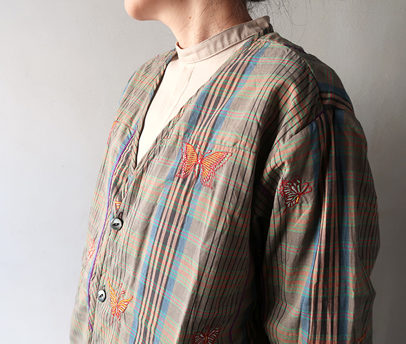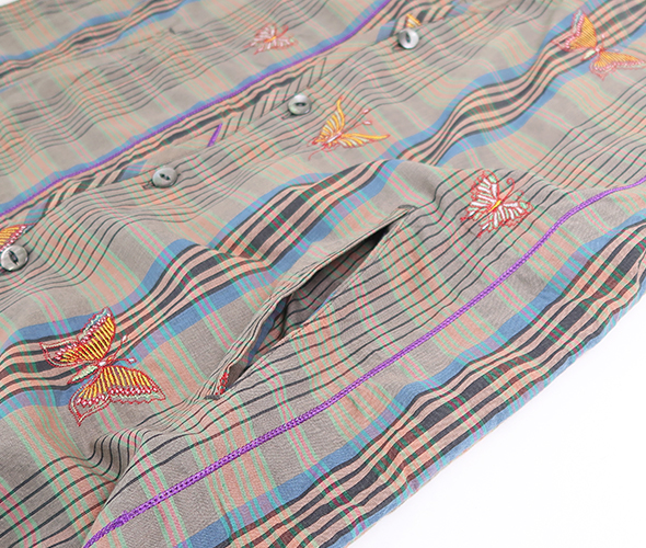 不規則なチェックパターンに、ブランドアイコンのパピヨンの刺繍やフィッシュアイボタンなど、個性的なディテールが光るアイテムです。軽やかな生地に、スッキリとしたVネックはレイヤードにも相性が良く、これからの季節重宝します。