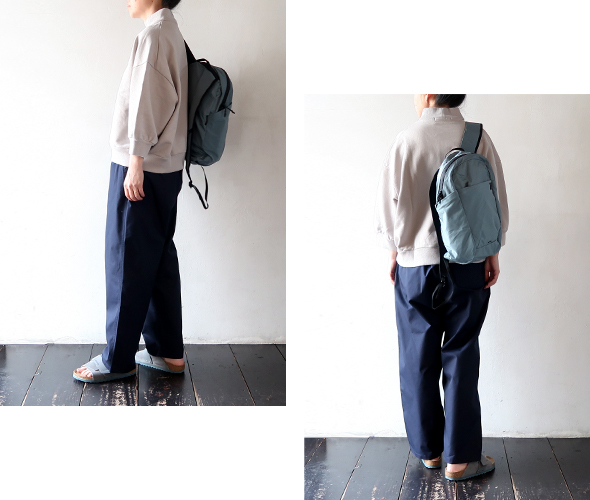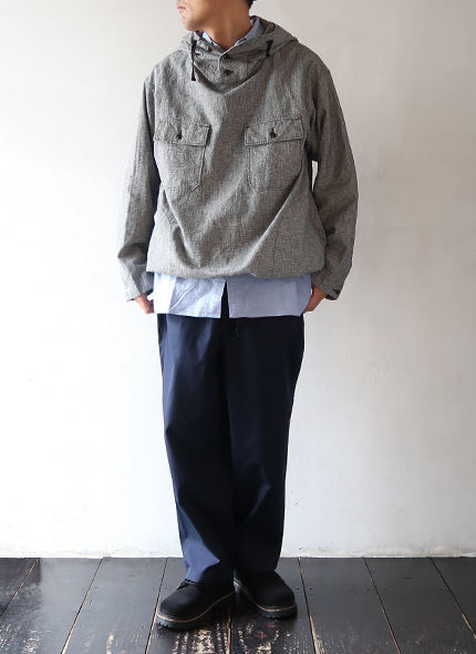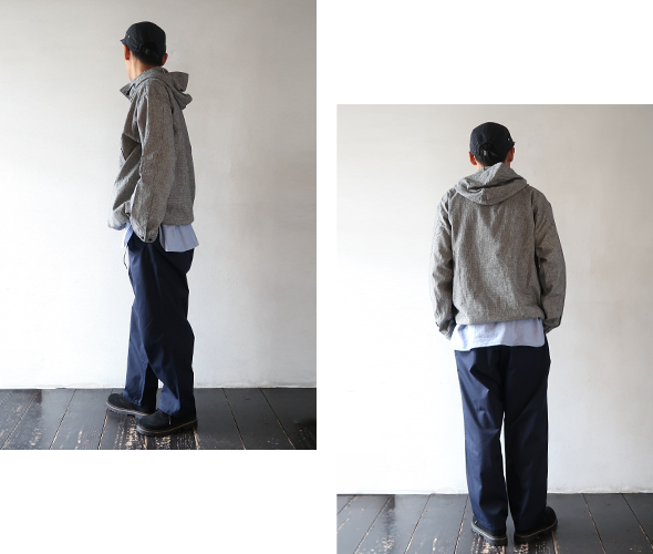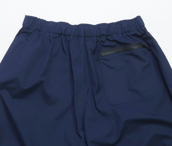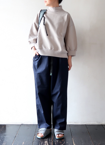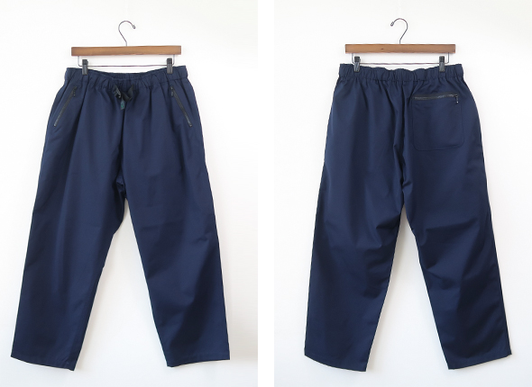 ゆとりがあるワイドテーパードのシルエットと、ジップポケットが特徴的なストリングパンツ。ウエストはドローコードのイージーな仕様となっています。