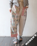 イージースタイルながらシルエットバランスが良いので だらしなく見えず、トップスも選ばず合わせやすい TIGRE BROCANTEで定番人気シルエットのミャオパンツが、手仕事の魅力の詰まったカンタ素材のパッチワークで入荷しました。USEDのサリー生地を重ね、丁寧に刺し子を施こす事により強度を増し、新しい表情で生まれ変わる良さを感じていただけます。生地元来の汚れやステッチのとびやほつれ、穴、ほころびが見られますが、それも特性として個々で異なる唯一無二の個性をお楽しみください。
