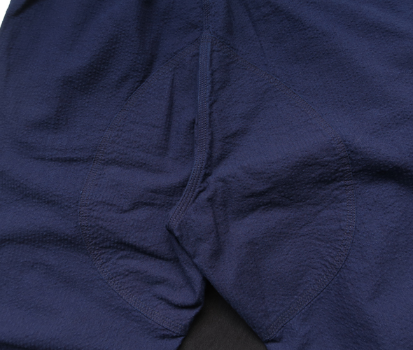 クライミングやボルダリングパンツにみられる、サイドではなくフロントで一枚の生地を合わせるデザインが採用されています。